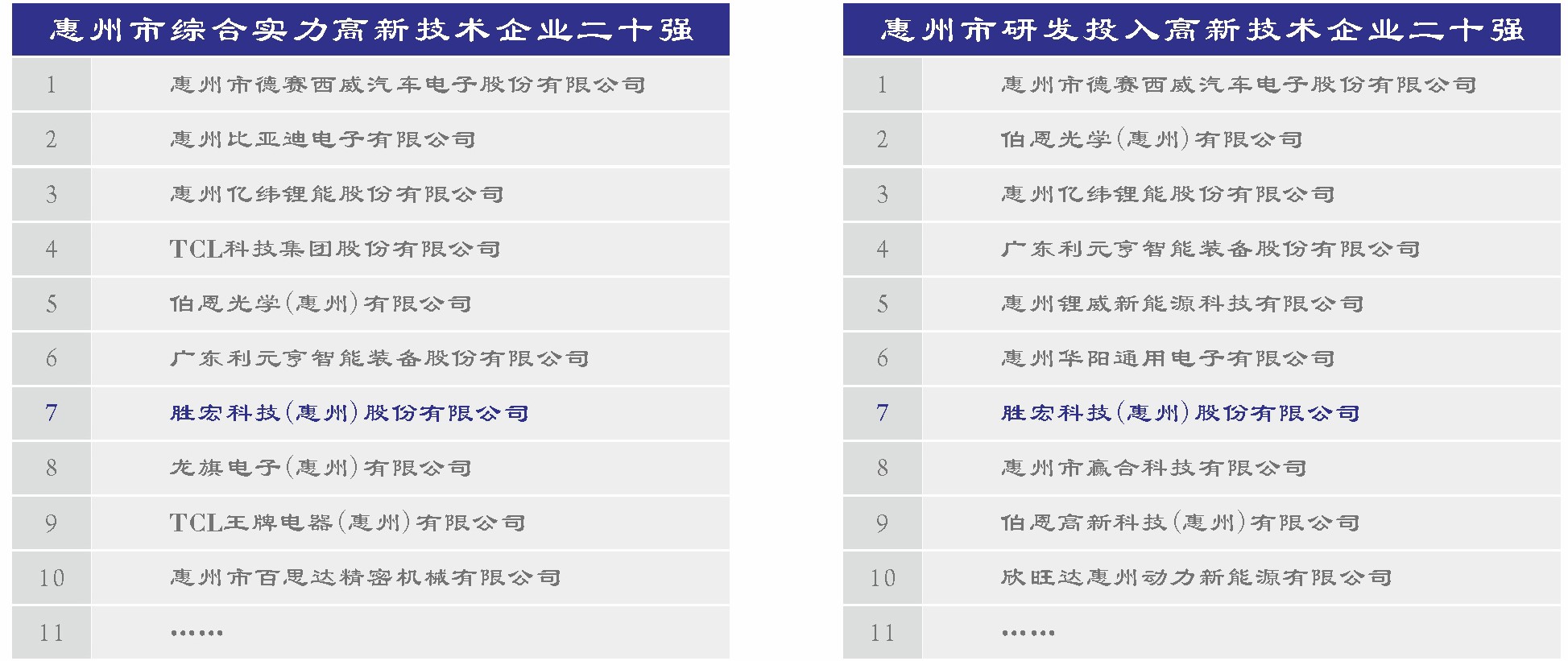 综合实力高企二十强是指经济规模、科技含量或者社会影响力等方面在我市具有领先地位,营业收入、营业利润、研发投入总额、硕士及以上研发人员数、市级以上创新平台、新增发明专利申请数、拥有有效发明专利数、技术合同成交金额等多项指标综合排名前20位的高新技术企业;研发投入高企二十强是指研发能力在惠州市具有领先水平、通过持续的研发投入促进核心技术自主可控,税前加计扣除的研发投入占营业收入的比重不低于3%且在我市排名前20位的高新技术企业。此次公司荣登双榜,彰显了我司深厚的研发能力与强劲的综合实力,是对我司在PCB领域技术创新、研发投入及成果的充分肯定。