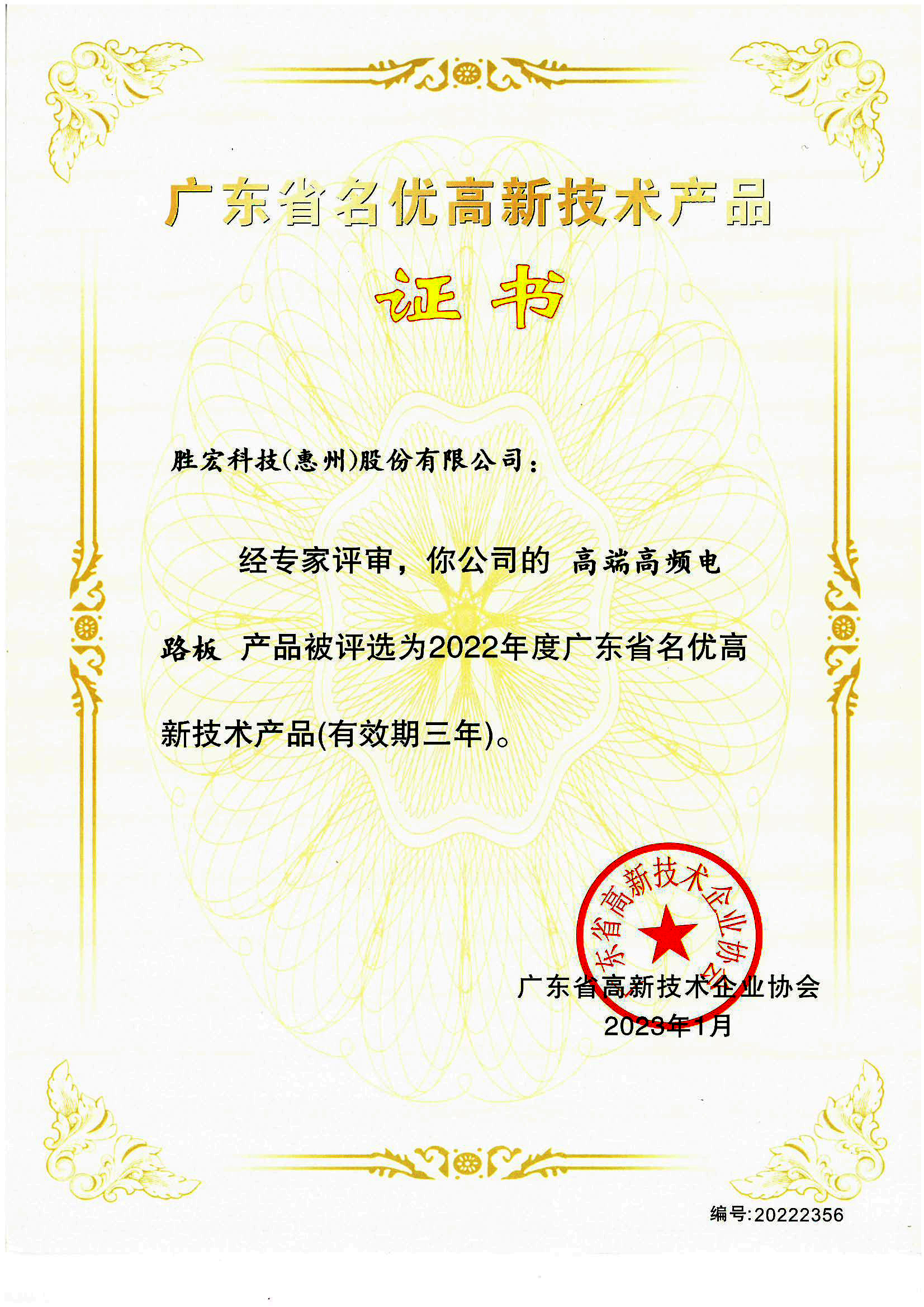 “高端高频电路板”名优高新技术产品证书